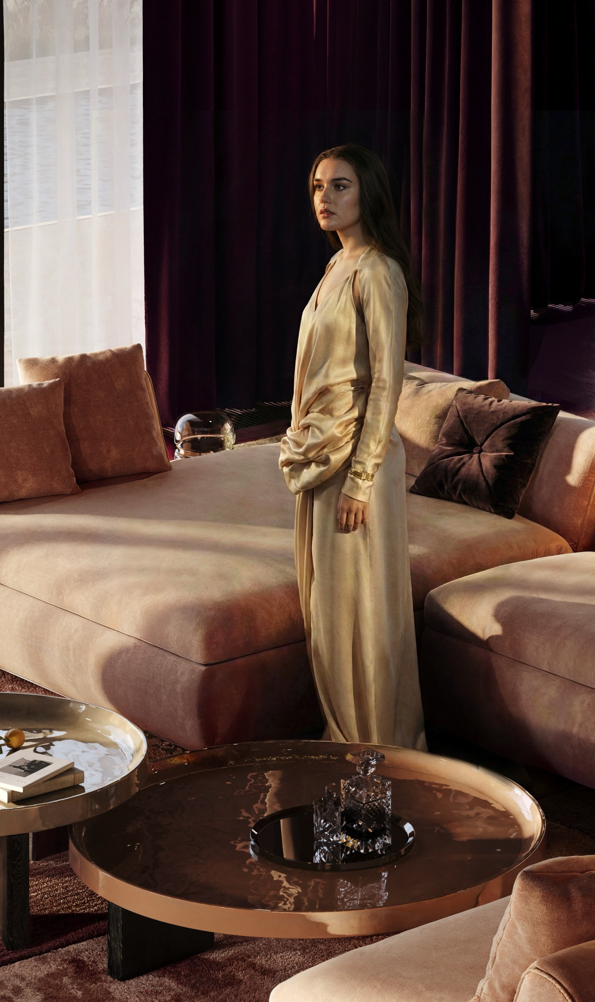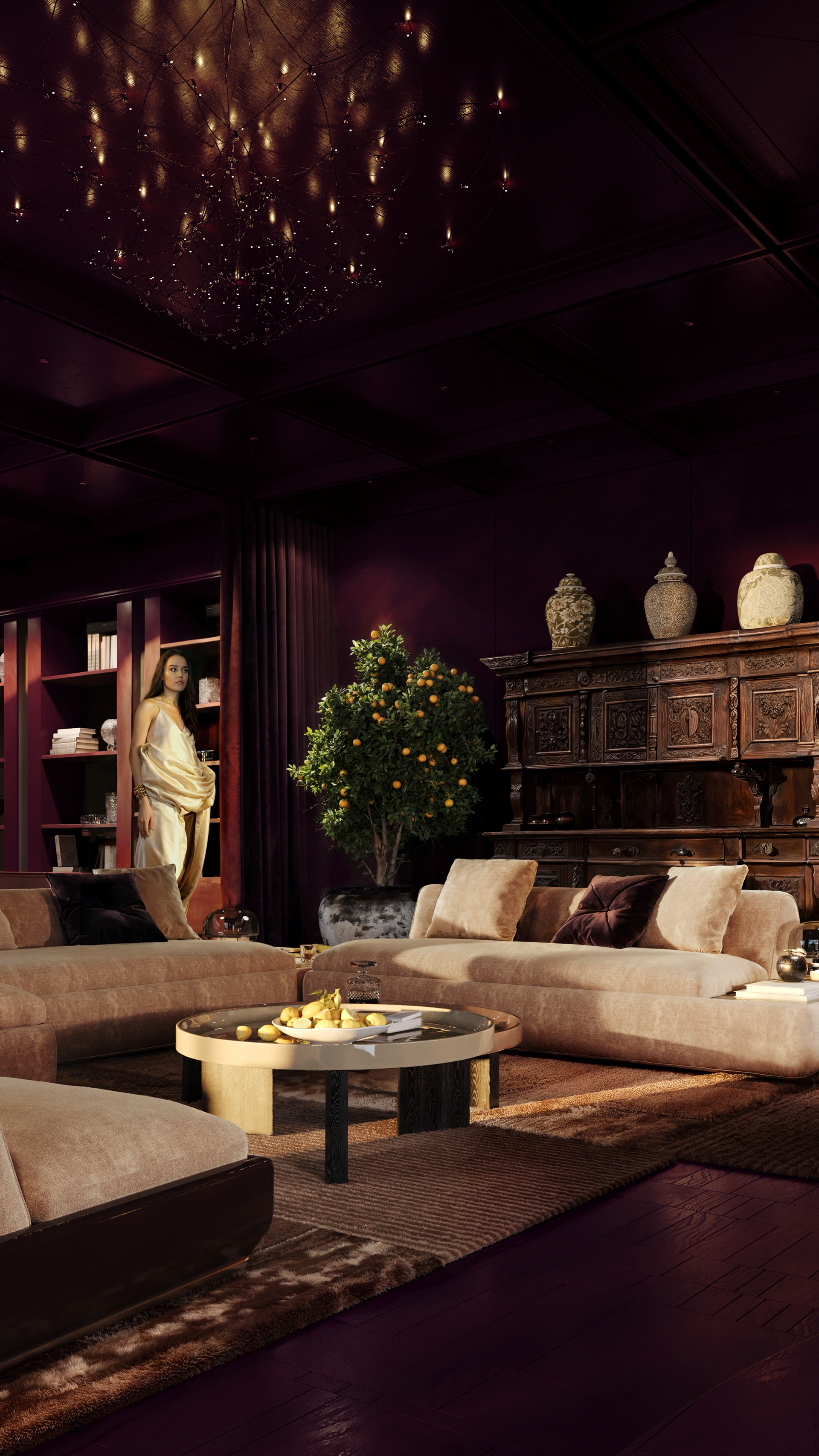 This luxurious living space seamlessly blends modern opulence with warm, inviting textures, creating an atmosphere of refined sophistication. The deep plum-colored ceiling and walls envelop the room in a rich, intimate ambiance, complemented by floor-to-ceiling velvet drapes that add a sense of drama and depth.