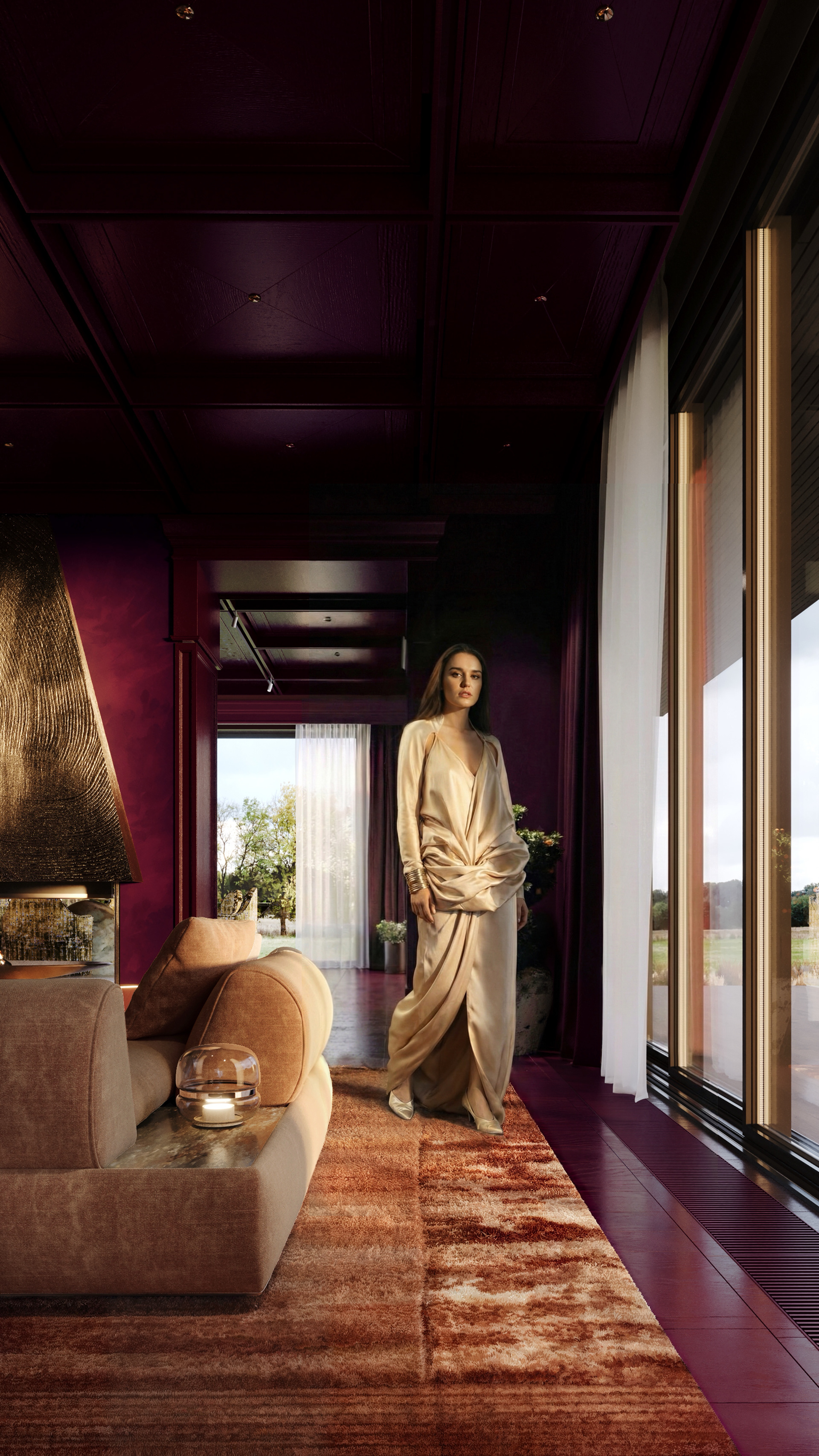 This exquisite living space embodies a perfect fusion of classic grandeur and modern sophistication, creating an atmosphere that is both opulent and inviting. The deep burgundy walls and ceiling envelop the room in a rich, intimate ambiance, while floor-to-ceiling windows bathe the space in natural light, offering a seamless connection to the serene landscape beyond.