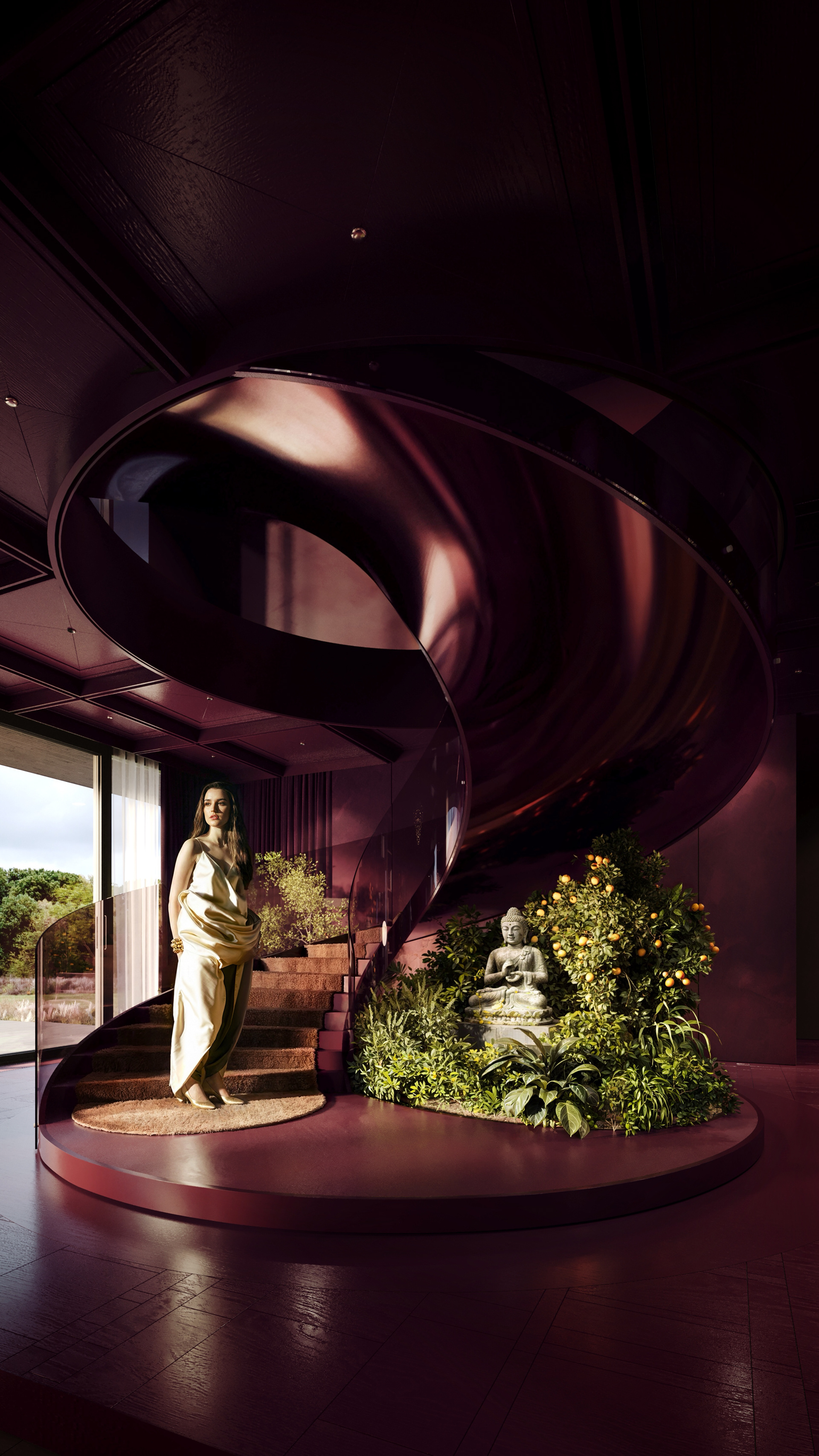 A sculptural spiral staircase, finished in high-gloss burgundy, becomes a striking focal point, leading the eye upward and enhancing the room’s grandeur. Nearby, lush greenery and citrus trees infuse the space with organic vibrancy, providing a refreshing juxtaposition to the structured furniture and architectural details.