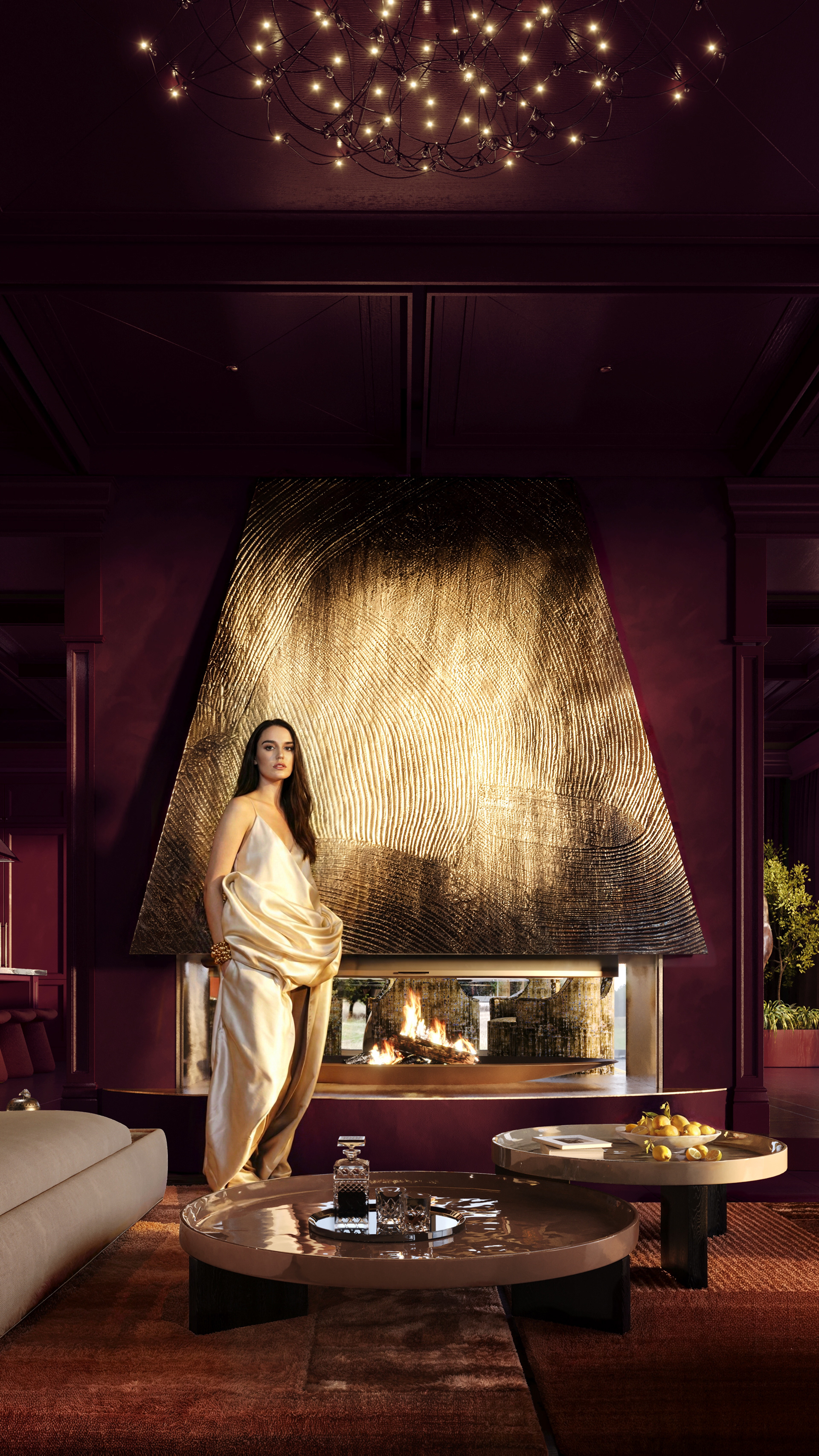 The fireplace serves as the room’s dramatic focal point, featuring a stunning sculptural hood with an intricate golden texture, reminiscent of organic patterns found in nature. The warm glow of the fire enhances the richness of the space, creating an inviting retreat. Above, a delicate chandelier with twinkling lights adds a celestial charm, complementing the refined aesthetic.